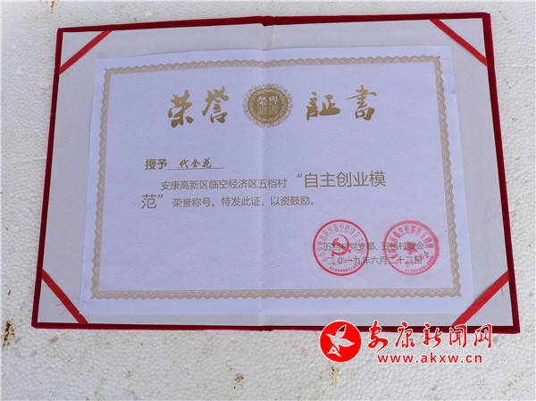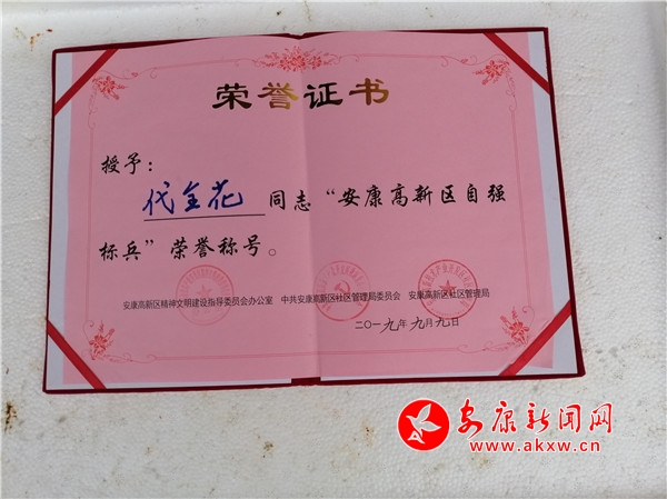 筆者從陳斌口中得知,2019年6月,代全花分別被安康高新區(qū)和五檔村黨支部、村委會(huì)授予“自強(qiáng)標(biāo)兵”和“自主創(chuàng)業(yè)模范”榮譽(yù)稱號,去年一家成功實(shí)現(xiàn)了脫貧。?