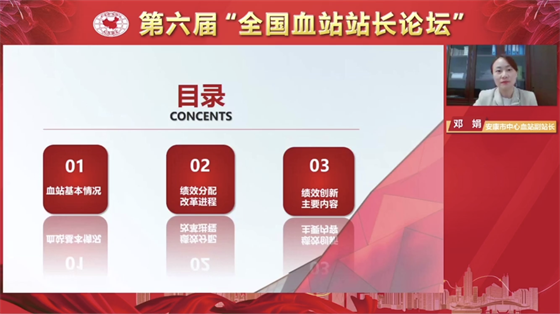 為加強(qiáng)全國(guó)血站的經(jīng)驗(yàn)交流與合作,2021年10月27日至28日,第六屆 “全國(guó)血站站長(zhǎng)論壇”在深圳市舉辦。中國(guó)輸血協(xié)會(huì)理事長(zhǎng)、世界衛(wèi)生組織輸血合作中心主任朱永明,深圳市衛(wèi)健委二級(jí)巡視員林漢城等相關(guān)領(lǐng)導(dǎo)出席并致辭。此次論壇的主題是“血站建設(shè)與發(fā)展、改革與創(chuàng)新”,來(lái)自全國(guó)各省、市血液中心(血站)的同仁通過(guò)線上方式參加會(huì)議。安康市中心血站副站長(zhǎng)鄧娟作為全國(guó)血站六個(gè)優(yōu)秀論文交流發(fā)言人之一,就安康血站績(jī)效分配、改革與創(chuàng)新工作在會(huì)上進(jìn)行了經(jīng)驗(yàn)交流。