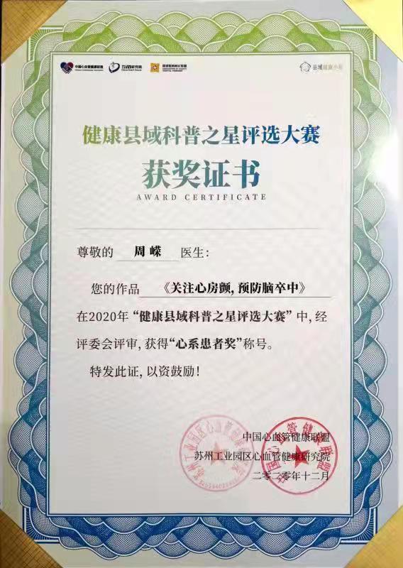 2021年 獲醫(yī)生云獎(jiǎng);獲“科普紅人直播賽十強(qiáng)”稱號(hào)