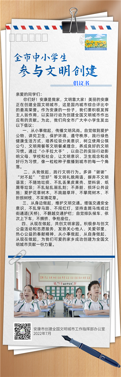 你們好!安康是我家,文明靠大家!美麗的安康正在創(chuàng)建全國文明城市,這是國內(nèi)城市綜合評比中的最高榮譽(yù)。作為安康的一份子,我們要積極發(fā)揮主人翁作用,以實(shí)際行動為創(chuàng)建全國文明城市作出應(yīng)有的貢獻(xiàn)。為此,我們向全市廣大中小學(xué)生發(fā)出以下倡議: