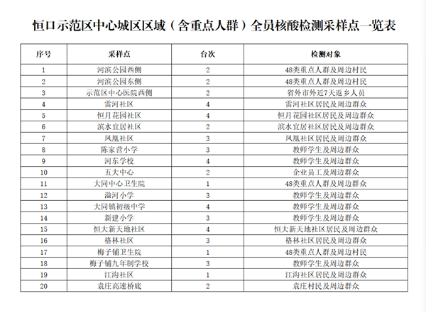 共設(shè)置20個采樣點、53個采樣臺(見附件),由相關(guān)責任單位統(tǒng)一負責采樣點設(shè)置、人員組織、秩序維護,檢測對象按現(xiàn)場工作人員要求,有序到指定地點進行采樣,避免人員聚集。