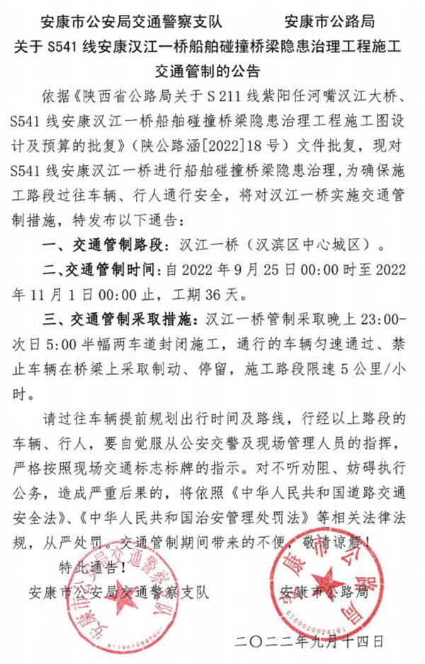 9月25日至11月1日安康漢江一橋?qū)⑦M(jìn)行船舶碰撞橋梁隱患治理工程施工,將對漢江一橋?qū)嵭?strong>交通管制36天,管制采取晚上23:00-次日5:00半幅兩車道封閉施工,通行的車輛勻速通過,禁止車輛在橋梁上采取制動(dòng)、停留,施工路段限速5公里/小時(shí)。