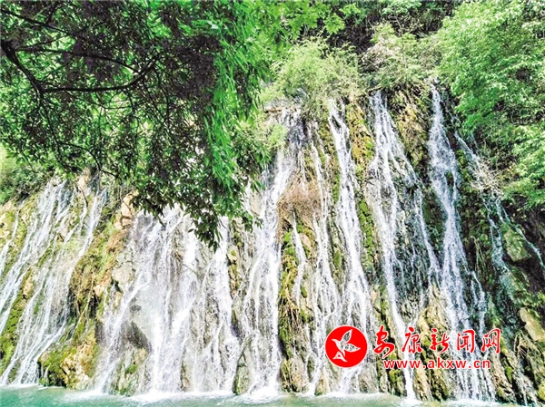 沿著木質(zhì)棧道前行,沒走多遠(yuǎn),耳中就傳來轟隆隆的水鳴聲,循聲望去,原來在大峽谷東南面的半山腰上有一掛巨大的瀑布。透過枝葉縫隙遙看瀑布的源頭,只見清清的泉水翻過一條石堰,從高高的崖壁口義無反顧地縱身飛躍而下,本是渾然一體的百米巨幅水簾,被凹凸不平的壁巖、樹枝、水草撕裂成形狀不一的一縷縷絹綢,千絲萬縷地交織著,撕扯著。細(xì)看,又猶如由萬千珍珠串起的珠簾,懸于半山腰間。瀑布四周彌漫著流云般的淡淡煙霞,初夏的陽光照耀著瀑布,折射出炫目的七彩光芒,形成一道道彩虹。粒粒珍珠流光溢彩、熠熠生輝。壁巖上嶙峋的怪石被水經(jīng)年累月地沖刷,早已失去了棱角,變得圓滑溫潤。因?yàn)槌睗竦木売?,巖壁上鋪了一層厚厚的、碧綠的青苔,讓瀑布有了層次感,像極了妙手丹青繪制的巨幅山水壁畫,鮮活靈動(dòng)。游人紛紛拿出手機(jī),在此排隊(duì)拍照、攝影留念。因它位于峽谷門口,似是迎接各位游客,故得名“迎賓瀑”。想到前幾日,朋友圈有人曬出聞名古今的廬山瀑布,只剩下一縷細(xì)細(xì)的溪流,從上面無力地流瀉下來,似是隨時(shí)都有中斷的可能,哪里還有“飛流直下三千尺,疑是銀河落九天”的氣勢(shì)時(shí),不由得對(duì)眼前的這掛瀑布更加喜愛。