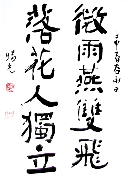 旸光先生淵博的家學(xué),深厚的學(xué)養(yǎng)為其書法技藝開掘出流淌不盡的源泉,正是他那非凡的經(jīng)歷與盤踞胸中的郁勃之氣,鑄就了別具一格的藝術(shù)風(fēng)采??v觀先生書法字里行間的布局、結(jié)構(gòu)、章法,即可以領(lǐng)略其高深的藝術(shù)修養(yǎng)。一般書法家給自己作品題款尚膽怯,更何況給山水畫人物、花鳥畫題款署名,書寫跋語,要求書者不但有深厚的文學(xué)功底賦詞作詩,再根據(jù)畫面的風(fēng)格,畫中所留空白虛實照應(yīng),用筆用墨的變化去應(yīng)對,好的款跋使作品升華。而先生無論行、草、隸、篆,縱橫涂抹,信手拈來如行云流水,宛若天成,令人折服,先生曾為不少后學(xué)作品撰寫款名,跋語至今記憶猶新。