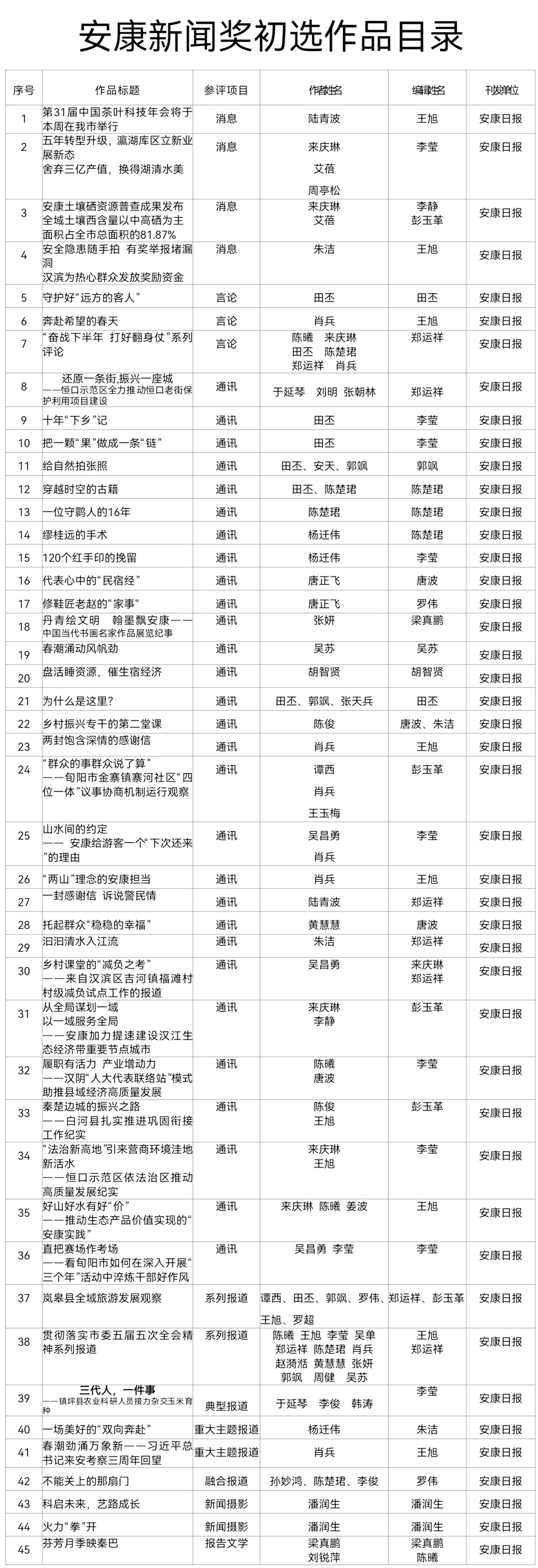 經(jīng)過3月20日編委會推薦、社黨委研究決定,擬推薦以下45件新聞作品參評2023年度“安康新聞獎(jiǎng)”。公示時(shí)間從2024年3月21日至2024年3月27日,公示期5個(gè)工作日。如有不同意見,請向安康日報(bào)社機(jī)關(guān)紀(jì)委、新聞管理部反映。