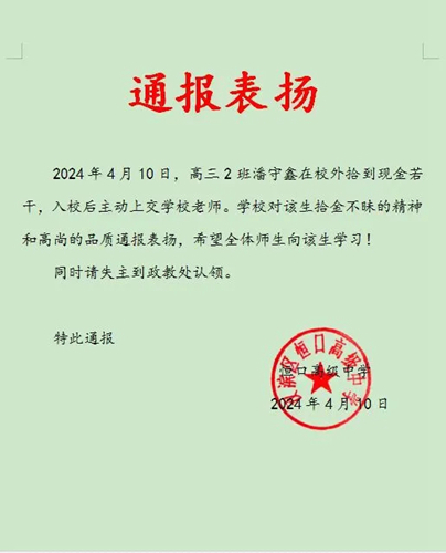 2024年4月10日早晨,高三2班潘守鑫同學(xué)在校門口拾到人民幣若干,在原地等了一會(huì)沒(méi)有失主來(lái)找,他毫不猶豫地走進(jìn)校園把錢交給政教處劉顯平老師。潘守鑫同學(xué)的行為展現(xiàn)了恒中學(xué)子良好的社會(huì)公德和個(gè)人素養(yǎng),為同學(xué)們樹立了一個(gè)好榜樣!