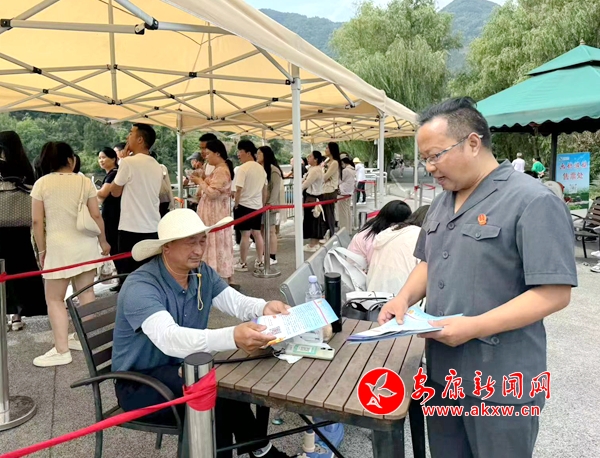 在各大景區(qū),法官干警給旅游景區(qū)的工作人員講解相關(guān)法律知識(shí)、教他們?nèi)绾我婪皶r(shí)處理與游客之間的矛盾糾紛,確保一旦發(fā)生旅游糾紛,第一時(shí)間有人報(bào)告、第一時(shí)間有人接待、第一時(shí)間有人解決。向來往游客和景區(qū)工作人員發(fā)放旅游法宣傳手冊(cè),對(duì)游客較為關(guān)注的“旅游者的權(quán)利、旅行社的義務(wù)、旅游安全如何保障、旅游糾紛如何解決”等進(jìn)行詳細(xì)解答,并向游客積極熱情解答各類法律咨詢。