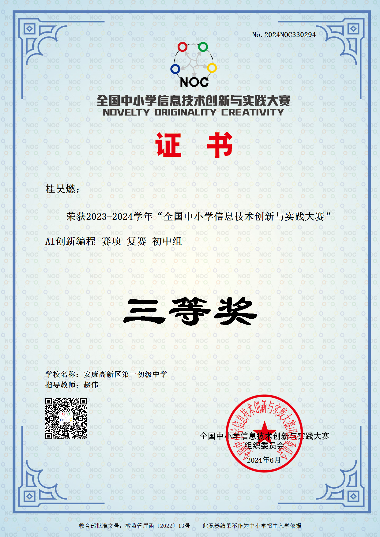 本網訊(通訊員 趙偉)近日,高新區(qū)第一初級中學桂昊燃同學在全國中小學信息技術創(chuàng)新與實踐大賽復賽中榮獲三等獎,該生由趙偉老師指導。