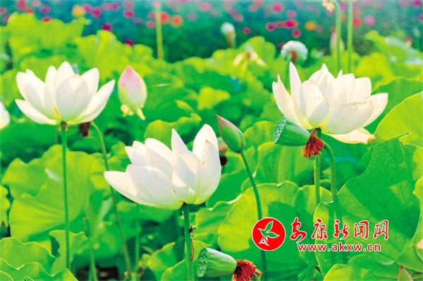 時(shí)至今日,倘單從觀賞的角度講,漢陰縣雙乳鎮(zhèn)的千畝荷塘所營(yíng)造的美景,亦是難得一見(jiàn)的。置身荷塘邊,千澄一碧。人仿佛闖進(jìn)荷的世界,頓生突兀、渺小之感,“接天蓮葉無(wú)窮碧,映日荷花別樣紅”中的無(wú)窮,就是此番氣象。那些翠綠的荷葉似圓盤(pán)一般,密密匝匝,不透一絲縫隙。而除了滿目的綠葉,高高低低間,荷花娉婷裊裊地立在荷塘,沖擊著人的視覺(jué)。那些吸引人眼球的粉白花朵,在藍(lán)天白云、青山綠水的映襯下,格外讓人憐愛(ài)。