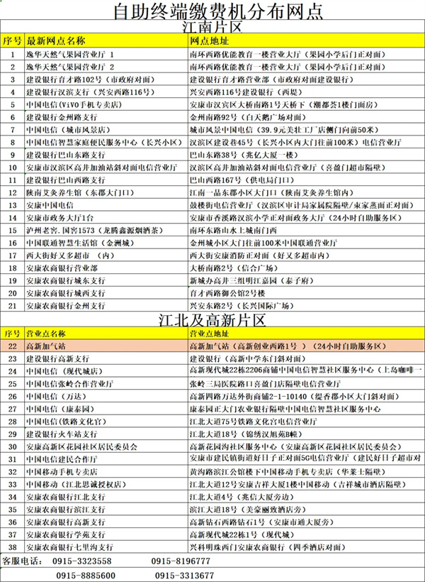 注意!安康天然氣可在以下網(wǎng)點(diǎn)進(jìn)行自助繳費(fèi)