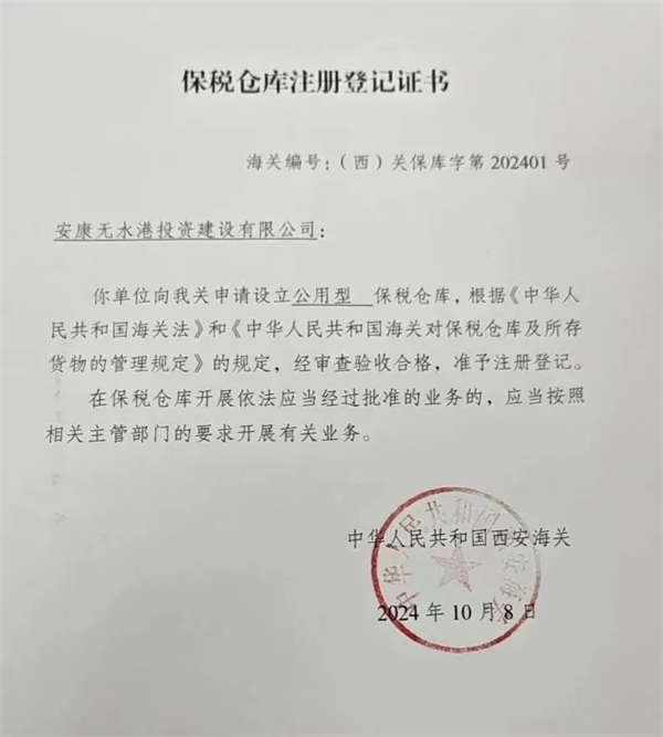 10月8日,由恒口示范區(qū)申請設(shè)立的“公用型保稅倉庫”正式通過海關(guān)審查驗收,成功獲得由西安海關(guān)頒發(fā)的《保稅倉庫注冊登記證書》,標志著該保稅倉已具備正式運營資質(zhì)和能力,可正式對外開展實際業(yè)務(wù)。