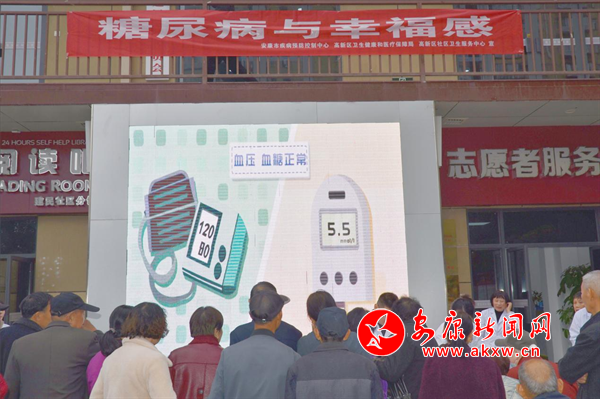 活動圍繞“糖尿病與幸福感”主題,通過懸掛橫幅、免費測血壓和血糖、循環(huán)播放糖尿病防治視頻、發(fā)放宣傳資料和支持性工具,市疾控中心工作人員向社區(qū)居民介紹了糖尿病的常見癥狀,日常生活中怎么預防糖尿病,糖尿病治療的“五駕馬車”,即健康教育、合理飲食、適量運動、規(guī)律用藥、自我監(jiān)測。共計發(fā)放各類宣傳品1500余份,測血壓血糖100人。