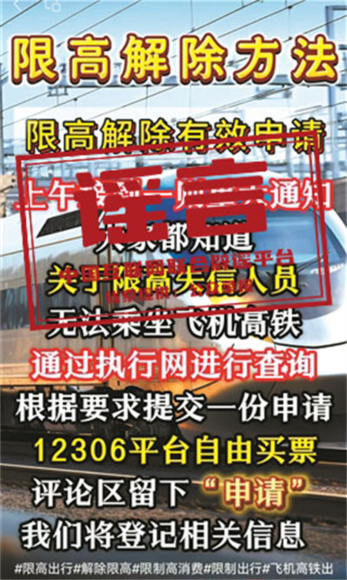 真相:近日,一些短視頻平臺頻現(xiàn)所謂“限高令新政”信息,宣稱“有內(nèi)部途徑,被限制高消費人員不用還款也能正常買機票、高鐵票”,引發(fā)關(guān)注。對此,最高人民法院執(zhí)行局相關(guān)負責(zé)人表示,關(guān)于“新政”一說實屬謠言。各級人民法院從未出臺過解除限制消費措施,或為不償還債務(wù)的限高人員提供長期“解限”的相關(guān)規(guī)定。網(wǎng)上關(guān)于對不履行生效法律文書確定義務(wù)的被執(zhí)行人解除限制消費措施等內(nèi)容均為不實信息。(來源:北京青年報)
