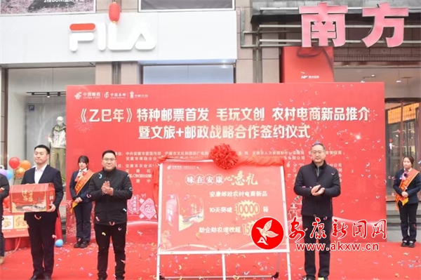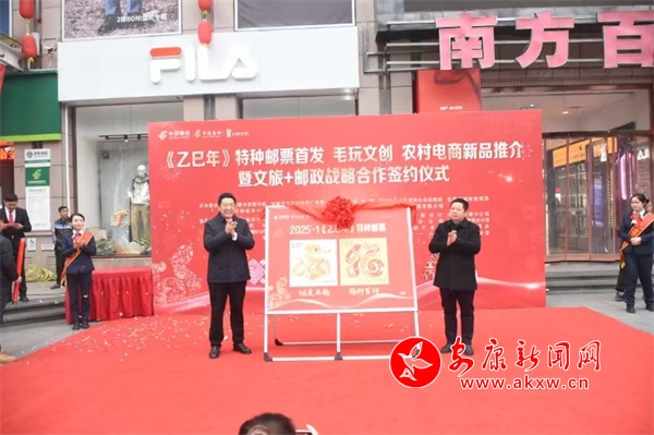 本網(wǎng)訊(通訊員 沈巧苗)龍騰辭舊歲,巳蛇報(bào)春來,1月5日上午9點(diǎn),《乙巳年》特種郵票首發(fā)、生肖毛玩文創(chuàng)、農(nóng)村電商新品推介暨文旅+郵政戰(zhàn)略合作簽約活動舉辦,現(xiàn)場參加活動人達(dá)300余人。