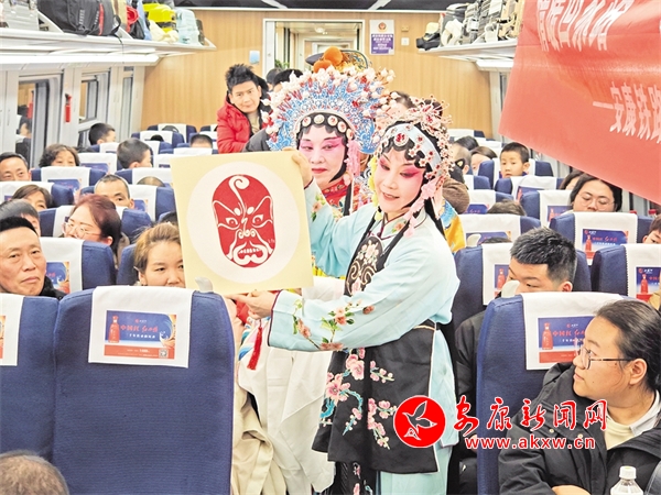 火車穿越秦巴山水間,途中,來自安康漢調(diào)二黃研究院的專業(yè)演員和地方民間漢調(diào)二黃愛好者們一同表演了國家級非物質(zhì)文化遺產(chǎn)——漢調(diào)二黃經(jīng)典戲曲演唱,并為旅客們講解漢調(diào)二黃戲曲知識,與旅客們開展互動(dòng)交流,讓旅客親身體驗(yàn)漢調(diào)二黃戲服道具,感受漢調(diào)二黃的獨(dú)特藝術(shù)魅力。來自漢濱區(qū)文化館的漢濱剪紙技藝傳承人為旅客們展示講解了安康市級非物質(zhì)文化遺產(chǎn)——漢濱剪紙技藝,向參與互動(dòng)的旅客送上了親手創(chuàng)作的漢濱剪紙作品,提前送上新春祝福?;顒?dòng)中,西安鐵路公安局安康公安處的民警們和文藝工作者們一同宣傳普及了反詐知識,進(jìn)一步提升旅客的安全防范意識。