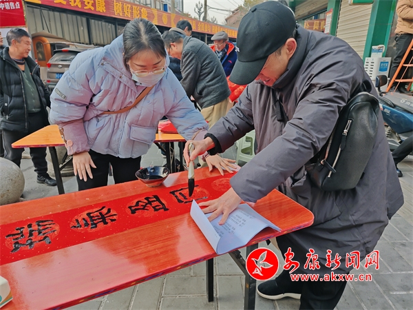 義寫(xiě)現(xiàn)場(chǎng),10余位書(shū)法家們凝神提筆,為社區(qū)群眾潑墨獻(xiàn)藝,楷書(shū)、行書(shū)、隸書(shū)等各種字體躍然紙上?!耙环L(fēng)順年年好,萬(wàn)事如意步步高”“蛇舞春風(fēng)傳喜訊,燕歸故里報(bào)佳音”等一副副寓意吉祥的春聯(lián)在筆下完成,一副副精心創(chuàng)作的年畫(huà)躍然紙上,令人賞心悅目,更有書(shū)法愛(ài)好者踴躍加入,與老師們互動(dòng)交流。社區(qū)的紅馬甲志愿者忙碌著分發(fā)、晾曬春聯(lián),聞?dòng)嵍鴣?lái)的群眾絡(luò)繹不絕,大家拿著手寫(xiě)的春聯(lián)和年畫(huà),喜悅之情溢于言表。本次活動(dòng)共書(shū)寫(xiě)對(duì)聯(lián)300余副,“福”字200余張,送出國(guó)畫(huà)作品40余幅。