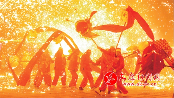 打鐵花點亮漢水之濱。林江 攝