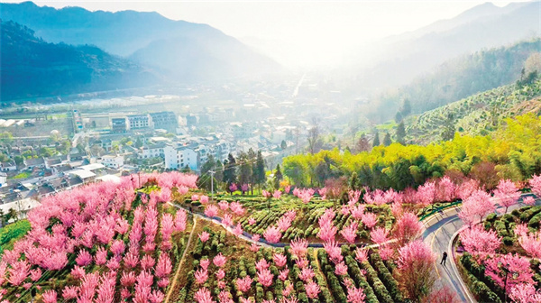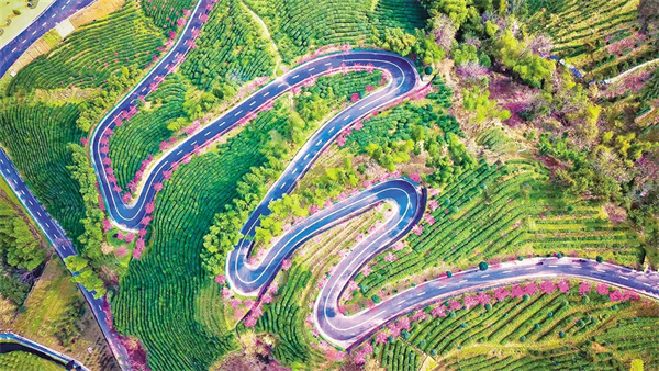 沿著茶山步道拾級而上,茶農(nóng)采青的竹簍與游人拍照的紗巾在梯田間次第閃現(xiàn)。粉白相間的梅花如云絮般綴滿枝頭,風(fēng)過處,花瓣簌簌落入茶叢,為嫩綠的新芽染上淡淡馨香。遠(yuǎn)處黛瓦白墻的徽派民居與近處起伏的茶壟構(gòu)成天然畫框,無人機(jī)視角下,蜿蜒的茶道如同玉帶纏繞山腰,將紅楓、櫻花、梅林串成斑斕的珠鏈。
