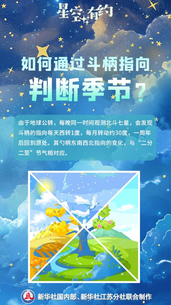 我國(guó)古人已經(jīng)能在初昏時(shí)通過觀測(cè)斗柄指向的變化來掌握節(jié)令,并總結(jié)出規(guī)律。王科超說:“先秦典籍《鹖冠子·環(huán)流》中即有‘斗柄東指,天下皆春;斗柄南指,天下皆夏;斗柄西指,天下皆秋;斗柄北指,天下皆冬’的記載。這里斗柄指向東、南、西、北四個(gè)方位的時(shí)間,大致與春分、夏至、秋分和冬至四個(gè)節(jié)氣對(duì)應(yīng)?!?/p>