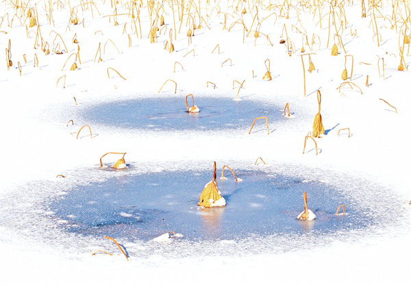 我的攝影創(chuàng)作圍繞生命的痕跡、時(shí)間的隱喻兩個(gè)主題。在《嘉實(shí)擷芳·野圃瑤音》中,菜園的微觀生態(tài)被賦予交響樂般的節(jié)奏——葫蘆藤的螺旋曲線是生命的律動(dòng),西紅柿根莖的垂直排列是生長的秩序,蚜蟲蝕痕的細(xì)節(jié)則暗喻生態(tài)的共生與抗?fàn)?。而在《澄漪棹影·沙月溯光》里,榮成海岸的冬夏對(duì)比成為時(shí)間的隱喻,結(jié)冰湖面上的凋敗蓮蓬是流逝凝固的時(shí)光,夏日海邊的金色水洼則是流動(dòng)的永恒。我癡迷于捕捉這種矛盾與共生——就像用冷暖色調(diào)碰撞出畫面的張力,也用虛實(shí)構(gòu)圖處理每一張照片,期待每一張照片是個(gè)性鮮明,讓人耳目一新。