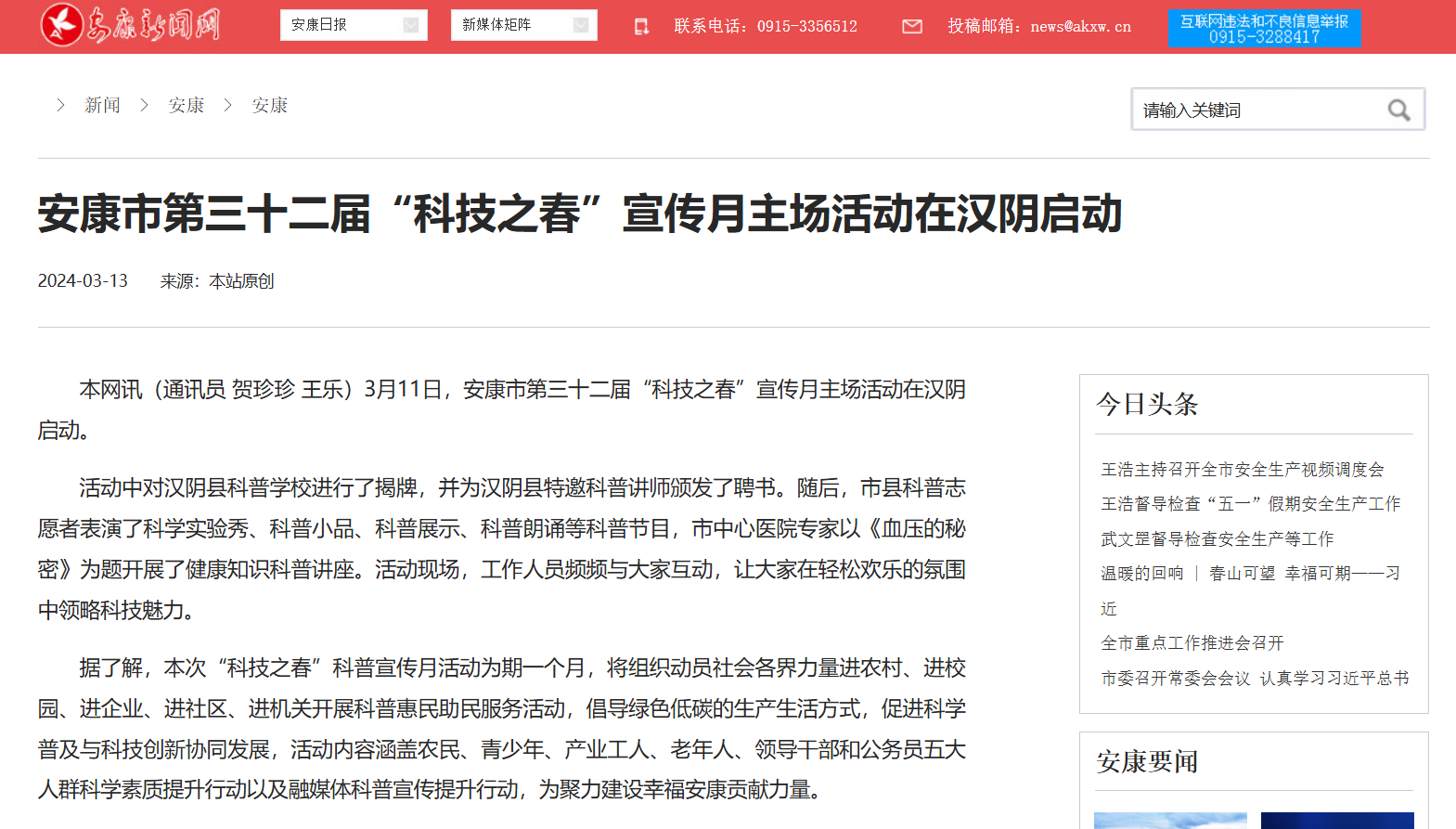 黨的二十大報(bào)告指出,培育創(chuàng)新文化,弘揚(yáng)科學(xué)家精神,涵養(yǎng)優(yōu)良學(xué)風(fēng),營造創(chuàng)新氛圍。為推動全民科學(xué)素質(zhì)全面提升,鼓勵(lì)全社會關(guān)注科學(xué)創(chuàng)新,形成崇尚科學(xué)的良好氛圍,安康新聞網(wǎng)通過“全國科普日集中宣傳”等主題宣傳,持續(xù)發(fā)布一系列民生科普報(bào)道,切實(shí)增強(qiáng)科學(xué)知識在群眾中的普及率,取到了良好的社會效果。