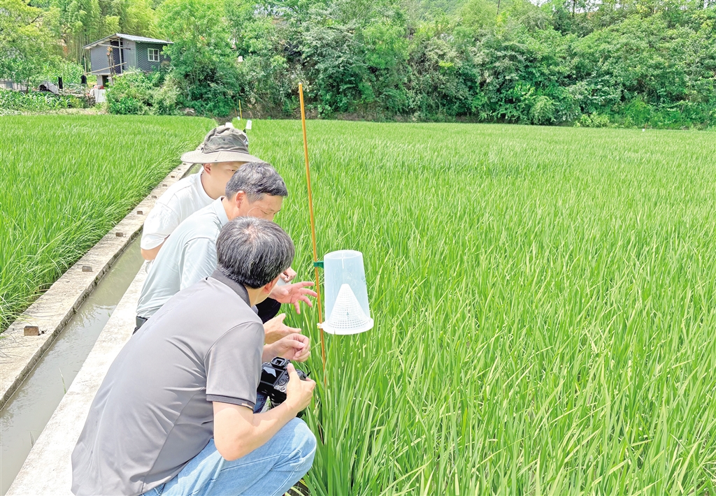 日頭漸漸升高,稻田里的露水被曬成水汽,連片的稻禾舒展著葉片,陽光下泛著健康的碧綠色。黃林權沿著田壟往前走,每經(jīng)過一個誘捕器就停下來,或調(diào)整角度,或記錄數(shù)量,鞋上的泥點濺到褲腿上也渾然不覺。