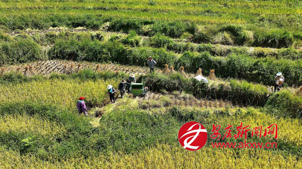 金秋時節(jié),漢陰縣鳳堰梯田景區(qū)迎來了一年中最動人的季節(jié)。層層疊疊的梯田上,稻穗低垂、金黃遍野,農(nóng)戶們穿梭其間,描繪出一幅忙碌而喜悅的豐收畫卷。