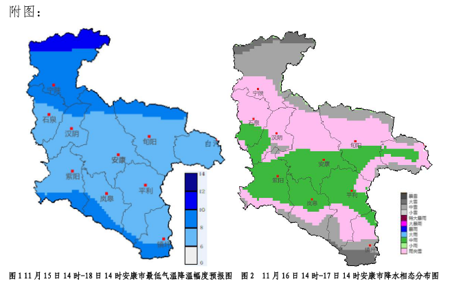 受冷空氣影響,15—17日全市過程日最低氣溫下降8~10℃,最低氣溫將出現(xiàn)在18日和19日清晨,全市大部會出現(xiàn)今冬初霜凍。預計最低氣溫:川道地區(qū)-4~2℃,中高山地區(qū)-8~-4℃,秦巴高山局地低于-8℃。16日夜間至17日白天我市大部有明顯吹風天氣,陣風可達5—6級。
