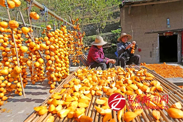 鄉(xiāng)親們趁著柿子還沒(méi)軟就采摘下來(lái),在房前屋后搭起一排排晾曬柿餅的木架,開始每年一次的傳統(tǒng)手工勞作:去皮、懸掛、晾曬。出霜后就成了美味的柿餅。