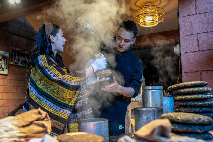 2024年4月13日,一名俄羅斯塔斯社記者(右)在大理市體驗包裝下關(guān)沱茶。據(jù)統(tǒng)計,2025年1月至6月,云南省接待入境過夜游客251.03萬人次,同比增長86%。