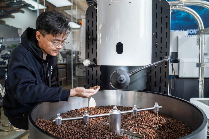 ? ? ? ? ? ? ? ? ? ? ? ? ? ? 2025年12月10日,韓君瑋在位于昆明的南來盛咖啡店內(nèi)烘焙咖啡豆。