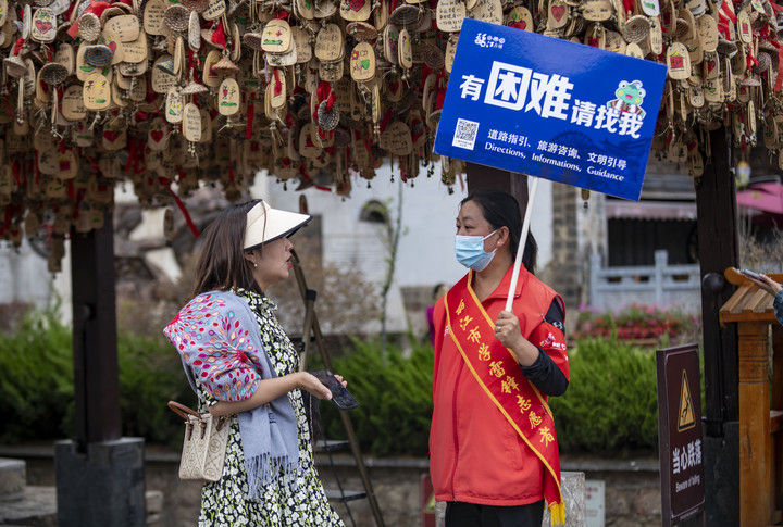 2023年5月18日,一名游客(左)在麗江古城向志愿者咨詢。2015年12月,云南麗江古城保護管理局牽頭成立了麗江古城旅游志愿者服務隊,志愿者主要來自市區(qū)機關(guān)單位、古城保護管理局、古城經(jīng)營戶、在校學生、社區(qū)居民等,常年在古城內(nèi)提供旅游咨詢、道路指引、文明引導等志愿服務。