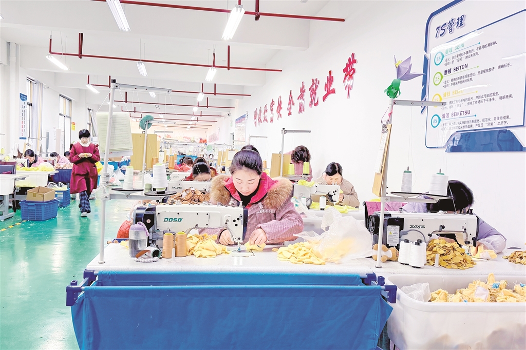 “十四五”期間,安康毛絨玩具產(chǎn)業(yè)取得顯著發(fā)展。圖為12月17日,在石泉縣城關(guān)鎮(zhèn)紅巖社區(qū)毛絨玩具社區(qū)工廠,工人們?cè)诹魉€上趕制元旦前最后一批訂單。