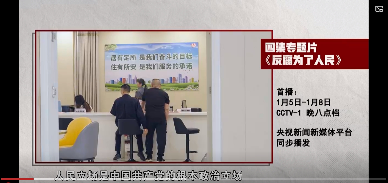 由中央紀委國家監(jiān)委宣傳部與中央廣播電視總臺聯(lián)合攝制的四集電視專題片《反腐 為了人民》,將于1月5日至8日在中央廣播電視總臺央視綜合頻道晚8點檔播出。