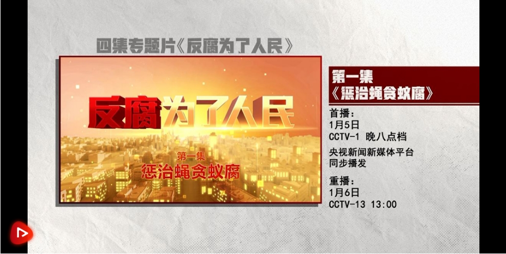 【解說(shuō)詞】《反腐 為了人民》第一集《懲治蠅貪蟻腐》,敬請(qǐng)關(guān)注。