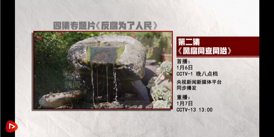 作風(fēng)建設(shè)永遠在路上,風(fēng)腐交織是現(xiàn)階段黨風(fēng)廉政建設(shè)和反腐敗斗爭要著力解決的突出問題。四集電視專題片《反腐為了人民》第二集《風(fēng)腐同查同治》,講述紀(jì)檢監(jiān)察機關(guān)堅持正風(fēng)肅紀(jì)反腐相貫通,以“同查”嚴(yán)懲風(fēng)腐交織問題,以“同治”鏟除風(fēng)腐共性根源,以“查”、“治”貫通阻斷風(fēng)腐演變,著力推動正風(fēng)反腐一體深化。央視綜合頻道1月6日晚8點檔播出,央視新聞新媒體平臺同步播發(fā)。