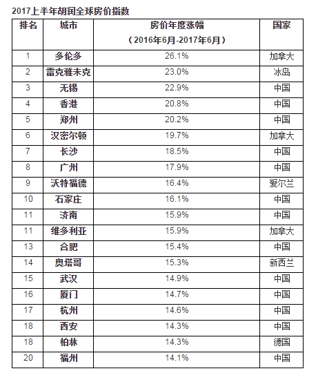 該報(bào)告中的房?jī)r(jià)變化對(duì)比的是2017年6月與2016年6月這12個(gè)月以來的數(shù)據(jù)。除了無錫排在全球第3位以外,香港排在第4位,鄭州排在第5位,長(zhǎng)沙排在第7位,廣州第8位,石家莊第10位,濟(jì)南第11位,合肥第13位,武漢第15位,廈門第16位,杭州第17位,西安排在第18位。