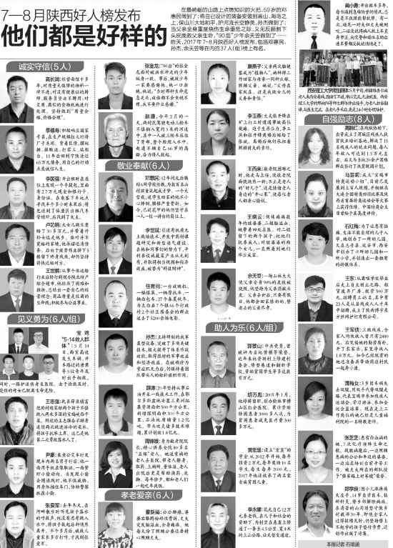 在最崎嶇的山路上點燃知識的火把,59歲的鄧惠民做到了;將自己設計的裝備安裝到高山、海島之上,保山川大地和平,護河流長空靜美,孫杰做到了;當父親全身重度燒傷生命垂危之際,義無反顧割下頭皮挽救父親生命,“90后”少年余天笠做到了……昨天,2017年7-8月陜西好人榜發(fā)布,包括鄧惠民、孫杰、余天笠等在內的37人(組)榜上有名。8AD安康新聞網