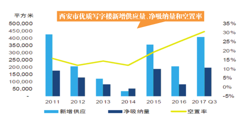 11月2日,房地產(chǎn)服務(wù)運營商戴德梁行發(fā)布今年第三季度市場報告顯示,隨著邁科中心等寫字樓入市,市場增加19.1萬平方米的優(yōu)質(zhì)寫字樓面積,全市甲級寫字樓總存量接近195萬平方米;全市凈吸納量累計值為85021平方米,其中高新區(qū)凈吸納量最高,為62110平方米。由于新項目入市,整體市場空置率升至30.58%,較上季度上升2.68個百分點。目前,西安寫字樓多集中于城市主干道沿線,同時,新入市的寫字樓品質(zhì)均較高,進一步提升城市寫字樓的整體水平。