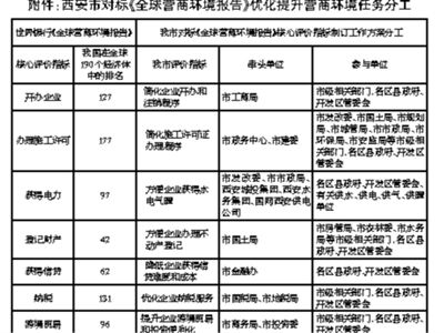 按照《西安市對標〈全球營商環(huán)境報告〉優(yōu)化提升營商環(huán)境任務分工》(見附件),各牽頭部門根據各自職責,從世界銀行《全球營商環(huán)境報告》中開辦企業(yè)、辦理施工許可、獲得電力、登記財產、獲得信貸、納稅、跨境貿易7個核心評價指標入手,圍繞減環(huán)節(jié)、優(yōu)流程、壓時限、提效率,牽頭制訂具體工作方案,于2017年10月31日前報市行革辦研究審定后組織實施。市統(tǒng)計局會同市行政學院盡快研究制訂我市縣域營商環(huán)境監(jiān)測評價指標,強化綜合衡量和定期排名,努力提升全市縣域營商環(huán)境和市場競爭力。