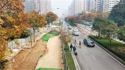 這里的圍擋給該路段的交通造成了一定的影響。記者注意到,從科技四路十字往南,圍擋占據(jù)了高新路西側整個非機動車道和部分人行道,35路公交站也被圍擋在內。由北向南的非機動車和行人途經(jīng)此路段時,不得不走上機動車道,與疾馳而過的各種機動車搶道。而高新路由北向南只有兩條機動車道,其中一條幾乎被非機動車和行人占據(jù)。