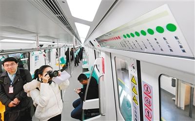 與目前開通的地鐵三條線路列車不同,四號線列車的座位旁邊沒有設(shè)置玻璃擋板,顯得更加開闊。報站的屏幕顯示著當(dāng)前實(shí)時時間、本趟列車終點(diǎn)站以及下一站,29座車站的字體變大,紅色燈表示已經(jīng)走過的車站,綠色燈表示將要到達(dá)的車站,讓乘客更易看清。