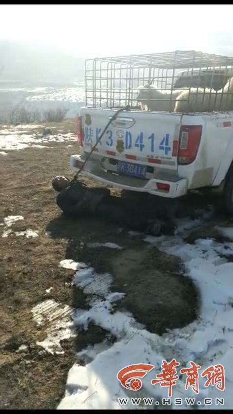 近日,一段視頻在榆林傳播,視頻中,3名年輕男子各抓著一只羊,一輛車(chē)牌照為陜K3D×××的執(zhí)法車(chē)停在一旁,車(chē)后的防護(hù)網(wǎng)中關(guān)著幾只羊,車(chē)尾有一男子平躺在地,一條繩索一頭套在他的脖子上,另一頭系在車(chē)的防護(hù)網(wǎng)上,車(chē)旁還有一名婦女跪在地上求請(qǐng)。婦女稱,草都在山溝里……他們實(shí)在沒(méi)辦法才這樣,有辦法的話就圈養(yǎng)起來(lái)喂了……