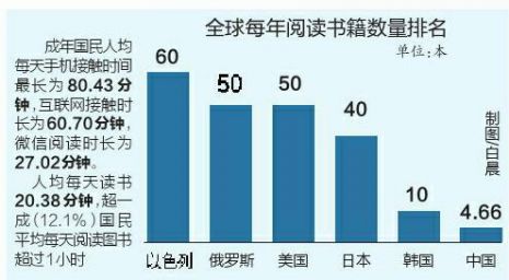 有網(wǎng)絡(luò)資料顯示,全世界每年閱讀書籍?dāng)?shù)量排名第一的是以色列,平均每人一年讀書量超過60本,俄羅斯和美國(guó)均在50本左右,而就算是我們的鄰居日本也達(dá)到40本左右,韓國(guó)較少卻也在10余本的水平。