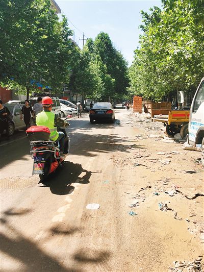 除了擁堵外,臟亂問題更是讓大家煩心。記者看到,在體育館東路北段的西側(cè),建筑垃圾、磚塊堆、塑料袋和廢棄材料等隨處可見、任意堆積,人行道已不復(fù)存在。一工地內(nèi)渣土與水混合在一起,使這條路泥濘不堪,空氣中也彌漫著嗆人的塵土味道,有的居民出行戴了口罩。“這個工地在這里一個多月了,垃圾、泥土、揚(yáng)塵到處都是,灑過水后路上又變得泥濘,統(tǒng)共一百來米的路,大路走不成,人行道被霸占!奔易”謪^(qū)工商局家屬樓的魏師傅推著嬰兒車,正在小心翼翼地邊走邊看,以躲避過往車輛。