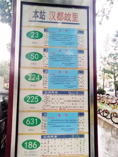 王女士說,她家住在漢城北路漢都故里小區(qū),門前有6條公交線,她在土門上班,每天乘坐23路和631路就可直達(dá)單位附近,十分方便?墒,8月20日下班回到小區(qū)門口的公交車站時(shí),發(fā)現(xiàn)有224路、50路、23路、631路公交站牌上貼著一張告示稱: 8月23日起,這4條公交線路取消漢都故里便民站。“漢城北路沿線除了漢都故里小區(qū)外,還有雅卓花園、簡約花園和風(fēng)尚馨筑等多個(gè)居民小區(qū),涉及的居民比較多,一下子取消了4條公交線,將會(huì)給多少人的出行帶來不便?”王女士說,8月23日早上,她在小區(qū)門口公交車站準(zhǔn)備乘坐公交車去上班時(shí),發(fā)現(xiàn)只剩下225路和186路,另外4趟公交車均不見蹤影。她朝南步行了10分鐘左右來到城西客運(yùn)站時(shí),發(fā)現(xiàn)這4條線路的起點(diǎn)站原來被挪移到了此處。