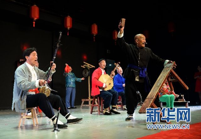 在陜西西安藍(lán)田縣白鹿原影視城,藝人們在表演華陰老腔(6月9日攝)新華社記者 劉瀟 攝