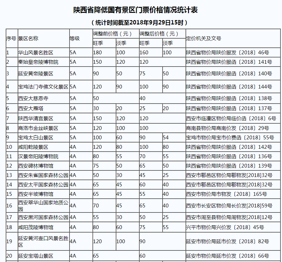 記者9月29日從陜西省物價(jià)局官方網(wǎng)站了解到,“十一”黃金周前夕,陜西省秦始皇帝陵博物院、華清宮、法門寺、黃帝陵、大雁塔、大慈恩寺、乾陵、漢陽(yáng)陵、西安碑林博物館、陜西牛背梁國(guó)家級(jí)自然保護(hù)區(qū)等一批國(guó)有旅游景區(qū)門票價(jià)格下調(diào),降價(jià)幅度在10%至20%之間。