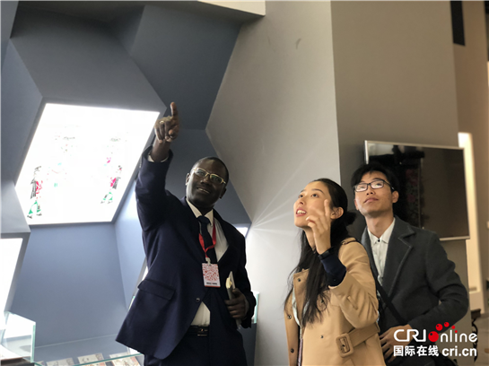塞內(nèi)加爾駐華大使館一等秘書夏赫·恩迪亞耶(左)了解渭南皮影戲(攝影 張琳瑞)