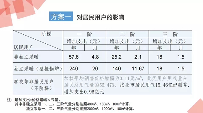 一是非獨(dú)立采暖用戶,按照調(diào)整后的居民用氣一階銷售價(jià)格,一階年最高氣量為480立方米計(jì)算,每戶年增加支出43.2元,月增加支出3.6元;二階最高氣量180立方米氣量計(jì)算,每戶年增加支出18元,月增加支出1.5元,對(duì)用氣量達(dá)到三階年最高氣量660立方米以上的用戶,氣價(jià)增幅0.14元每立方米,用氣100立方米,增加支出14元。